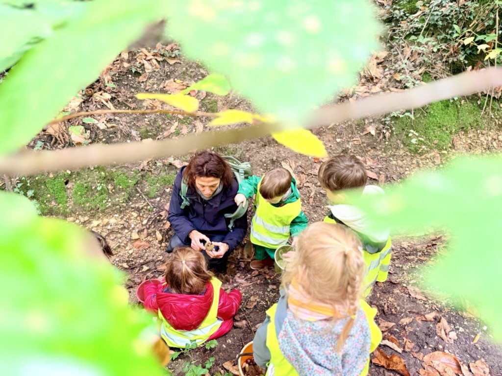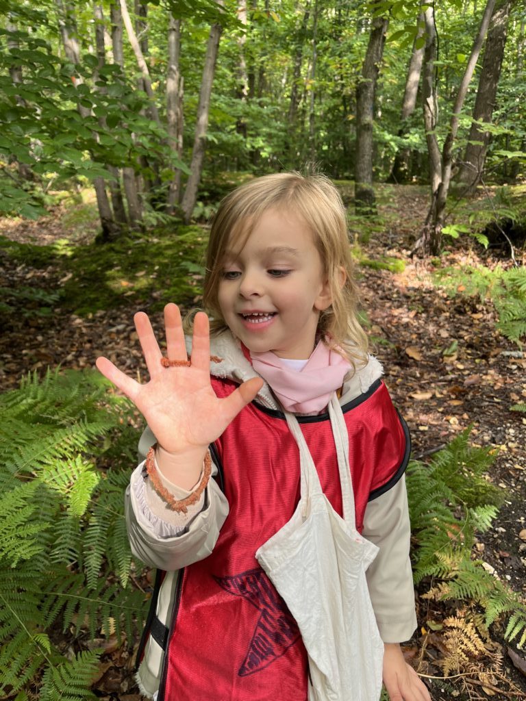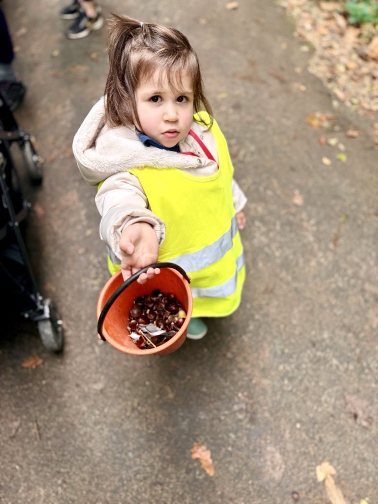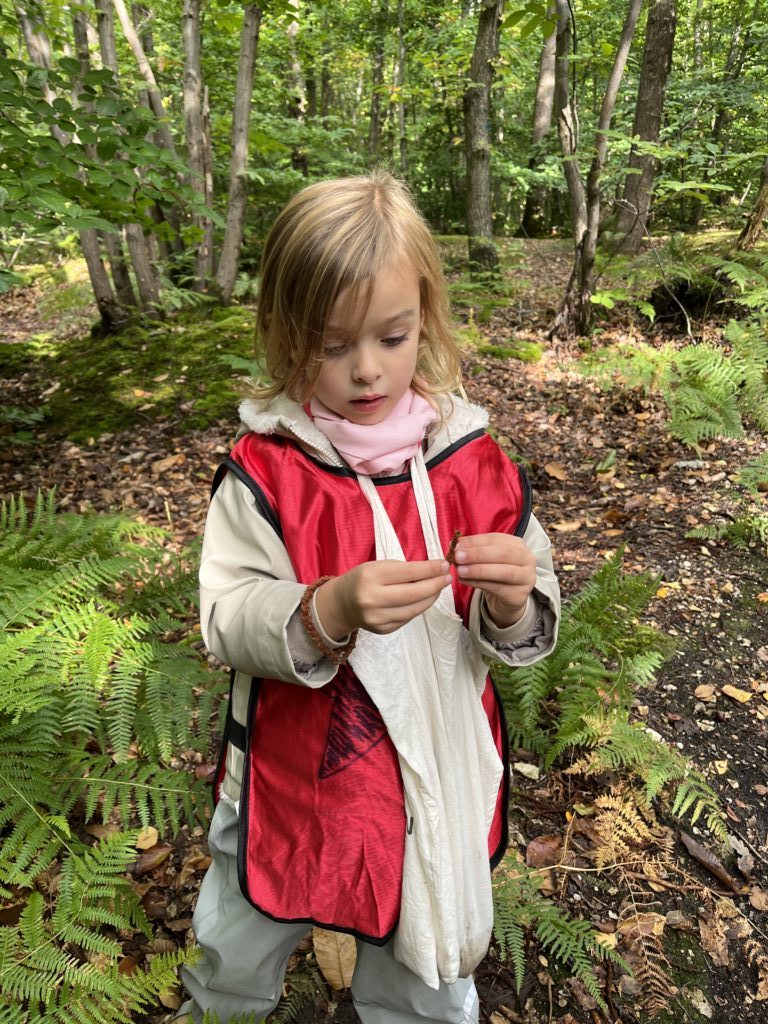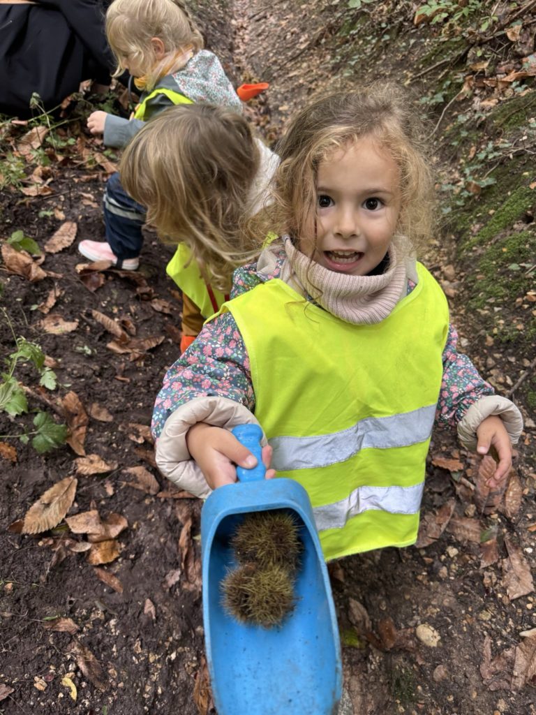 On découvre des petites bêtes, larves, vers de terre, on trouve pleeeeeeiiiin de champignons mais dans le doute on n’y touche pas !! Les châtaignes sont magnifiques !! Les feuilles sont encore bien vertes, on est à la porte d’entrée de l’automne !