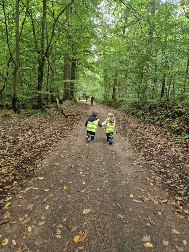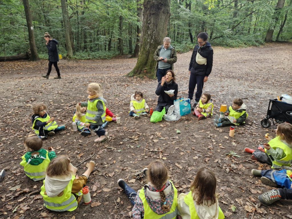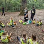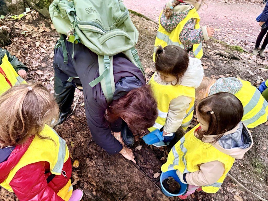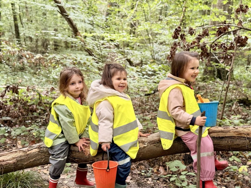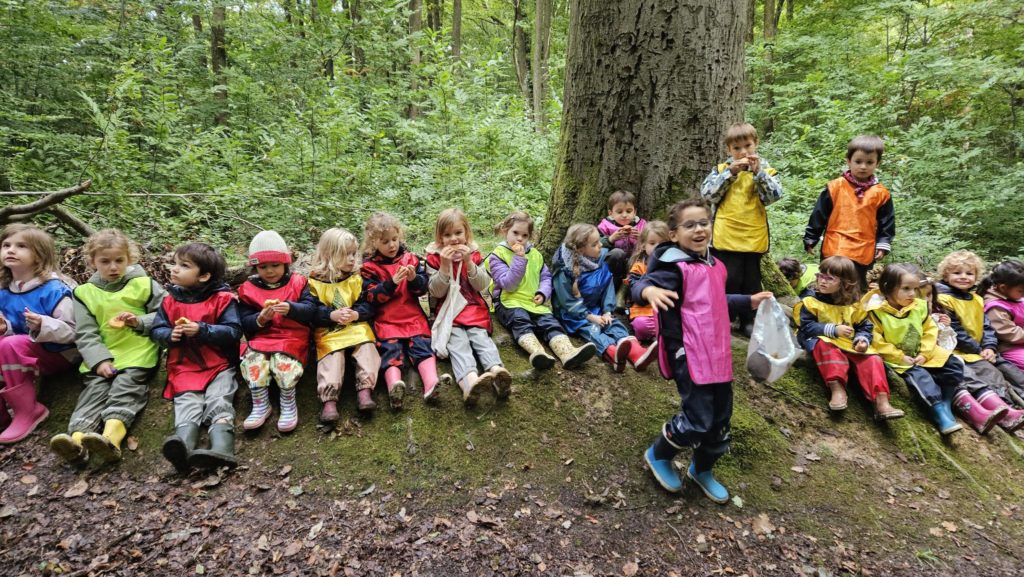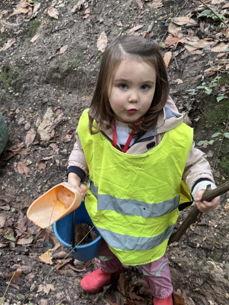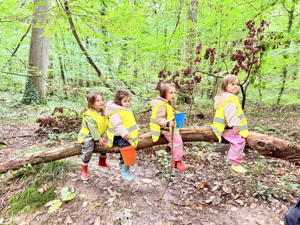 Un rayon de soleil pointe le bout de son nez ! On se promène, en direction de nos endroits préférés de la forêt : sur une petite colline les MS et GS aiment creuses « leur trou vers le centre de la terre », chez les plus petits, on grimpe sur des grosses branches qu’on transforme en petit train !