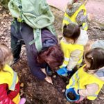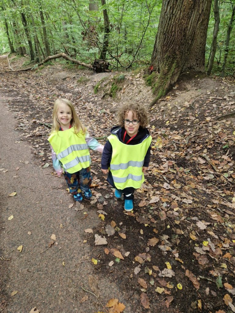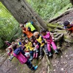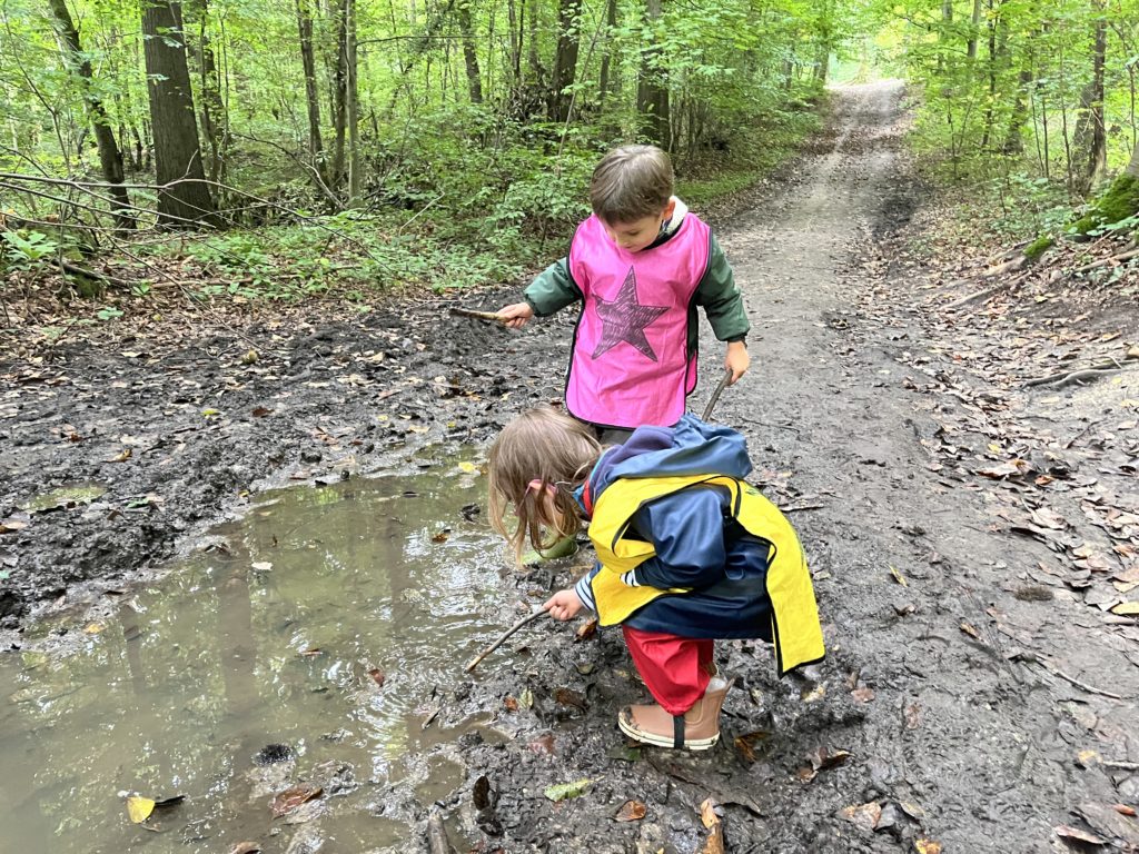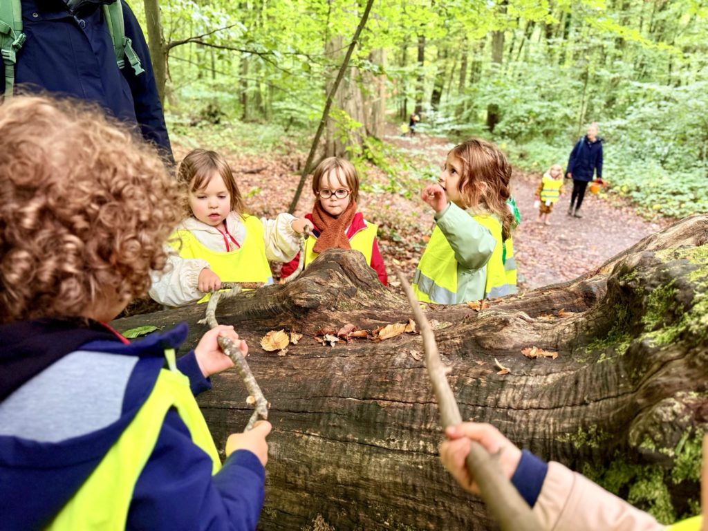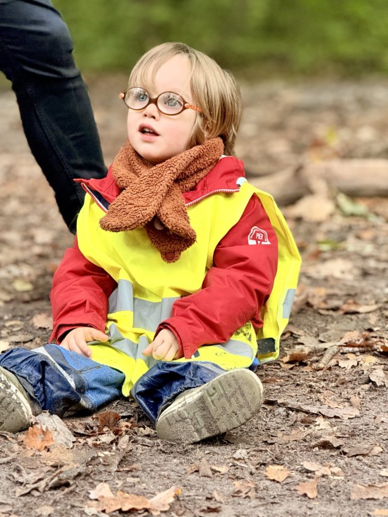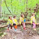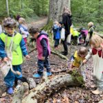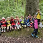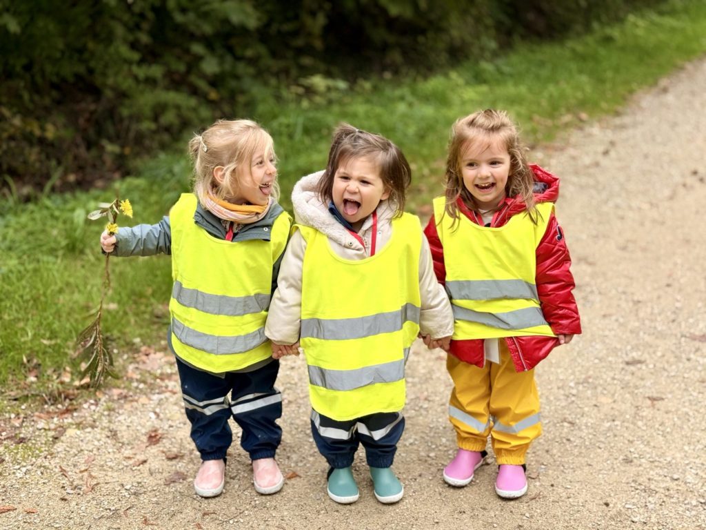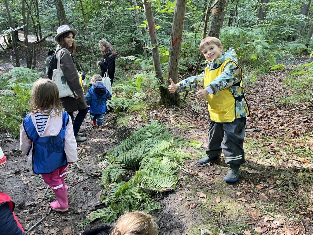 Un rayon de soleil pointe le bout de son nez ! On se promène, en direction de nos endroits préférés de la forêt : sur une petite colline les MS et GS aiment creuses « leur trou vers le centre de la terre », chez les plus petits, on grimpe sur des grosses branches qu’on transforme en petit train !