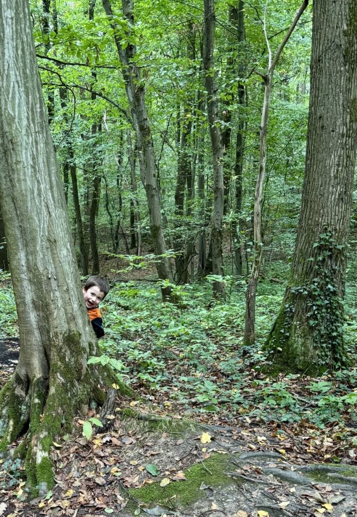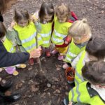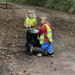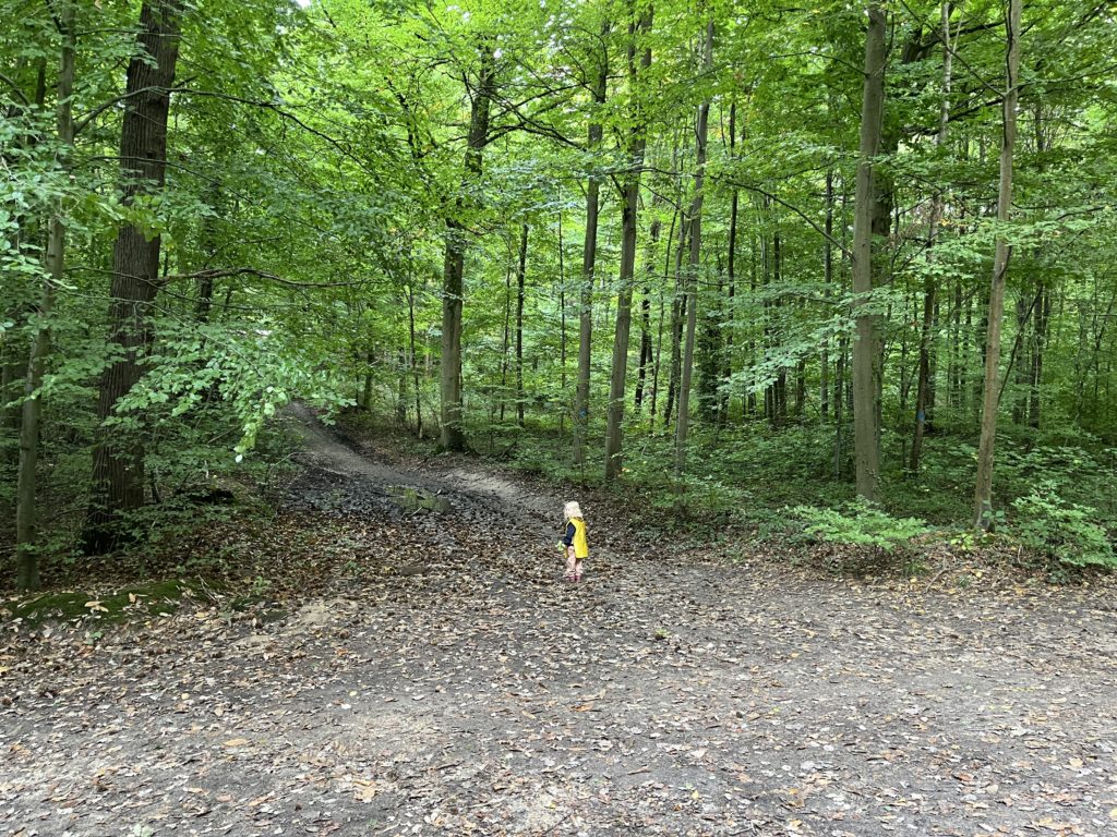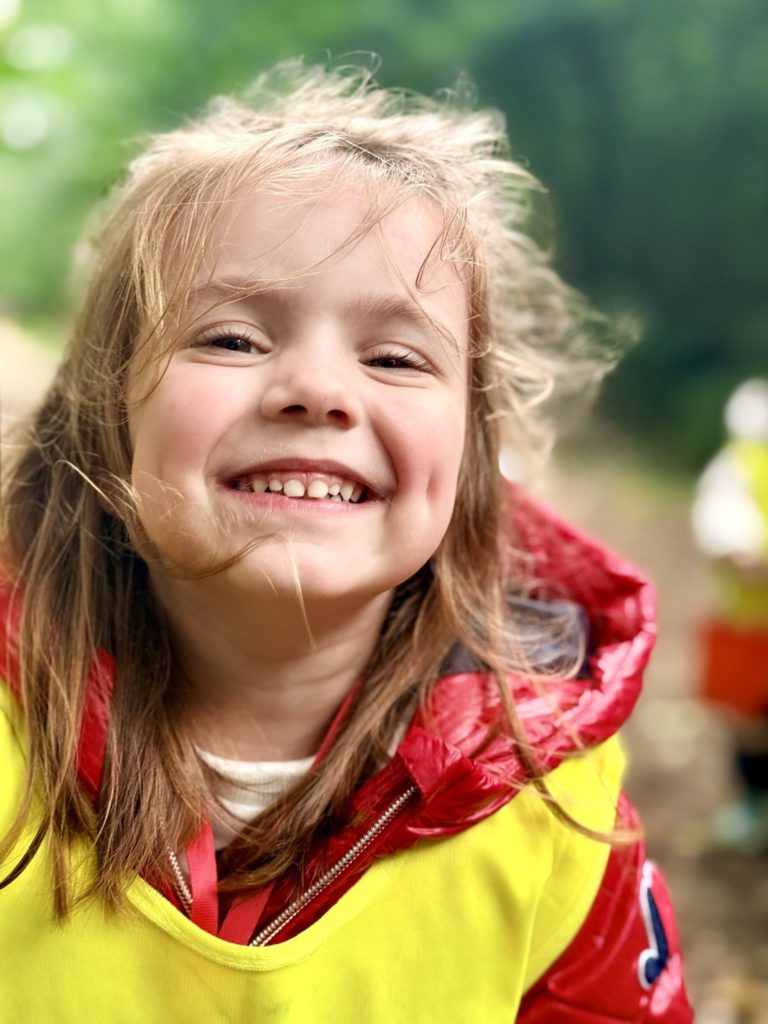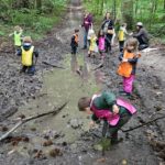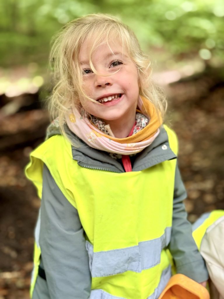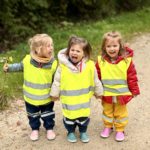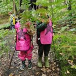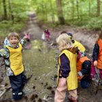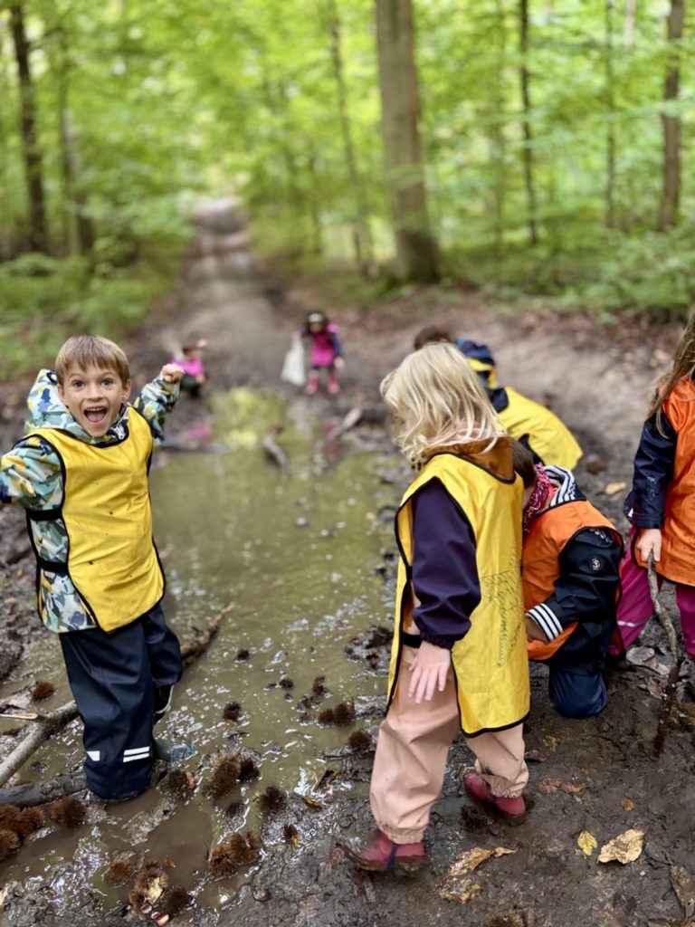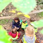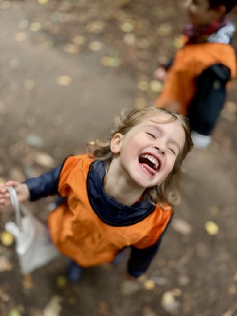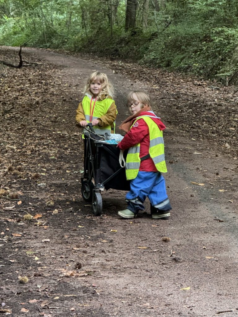 Un rayon de soleil pointe le bout de son nez ! On se promène, en direction de nos endroits préférés de la forêt : sur une petite colline les MS et GS aiment creuses « leur trou vers le centre de la terre », chez les plus petits, on grimpe sur des grosses branches qu’on transforme en petit train !