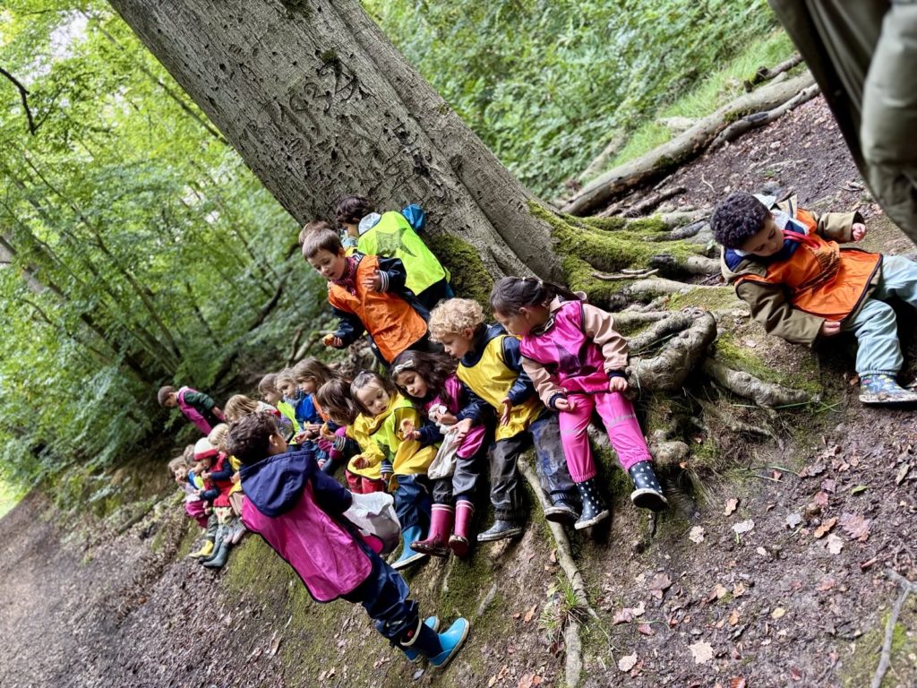 C’est l’heure du goûter ! On s’installe au pied de l’arbre préféré de Véro chez les MS/GS et en cercle un peu plus loin chez les PS/TPS. On déguste et on savoure quelques gâteaux et c’est reparti pour jouer !