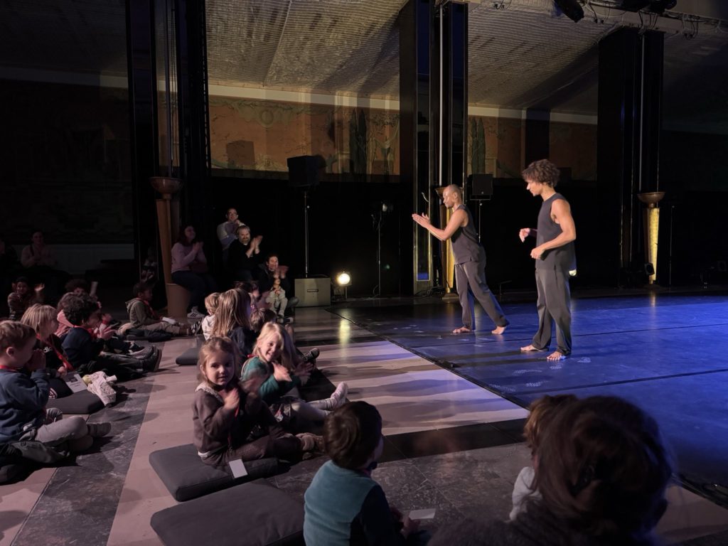 Nous avons la chance de pouvoir échanger avec le duo d’artistes qui partagent avec nous leur complicité, le respect qu’ils éprouvent l’un pour l’autre et l’envie de faire de leurs différences une richesse en unissant leurs talents respectifs. D’ailleurs si le spectacle s’appelle « Yës » c’est tout simplement car les deux acolytes qui le portent se nomment Yanice et Sébastien. Ils apportent aussi un autre témoignage fondamental : avant de réussir les performances techniques qu’ils ont réalisées il y a énormément de travail, de répétition avec l’aide du regard critique du chorégraphe pour réussir petit à petit à atteindre l’objectif qu’ils se sont fixé. Leur passion les poussait à se dépasser et à chercher toujours à donner le meilleur d’eux-mêmes car ils avaient une telle envie de réussir à exécuter quelque chose qui soit « beau » et un tel plaisir quand il y parvenait que peu importe le temps et les efforts nécessaires. Une jolie leçon de vie pour nos petits !
